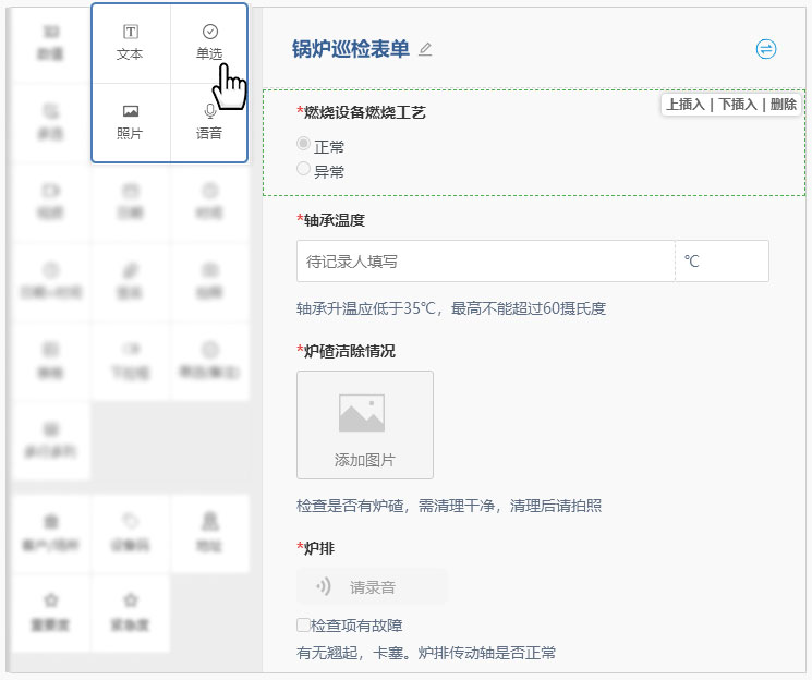 2、在巡檢表單設(shè)計(jì)中,您可以為大部分的檢查項(xiàng)設(shè)定合格范圍。不合格表單可以被單獨(dú)訂閱、統(tǒng)計(jì)或作為觸發(fā)工單系統(tǒng)的條件。比如:溫度值范圍,單選、多選的不合格項(xiàng)等等。此外,在表單設(shè)計(jì)中您還可以為巡檢項(xiàng)填寫(xiě)檢查方法及檢查標(biāo)準(zhǔn),供巡檢人隨時(shí)查看。