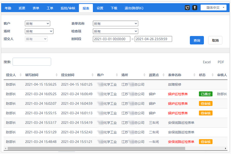 表單報(bào)表有“表單詳情報(bào)表”、“已提交表單報(bào)表”、“異常表單匯總報(bào)表”、“表單審核”報(bào)表、“異常表單監(jiān)控”報(bào)表。